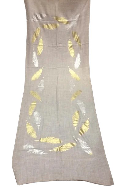 Écharpes et châles cachemire premium avec finitions métalliques (foil), conçus pour les collections luxe, cadeaux d’entreprise et distribution haut de gamme.